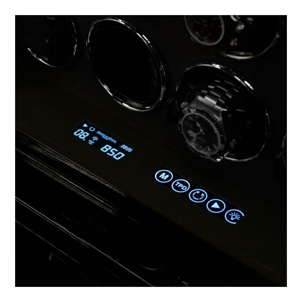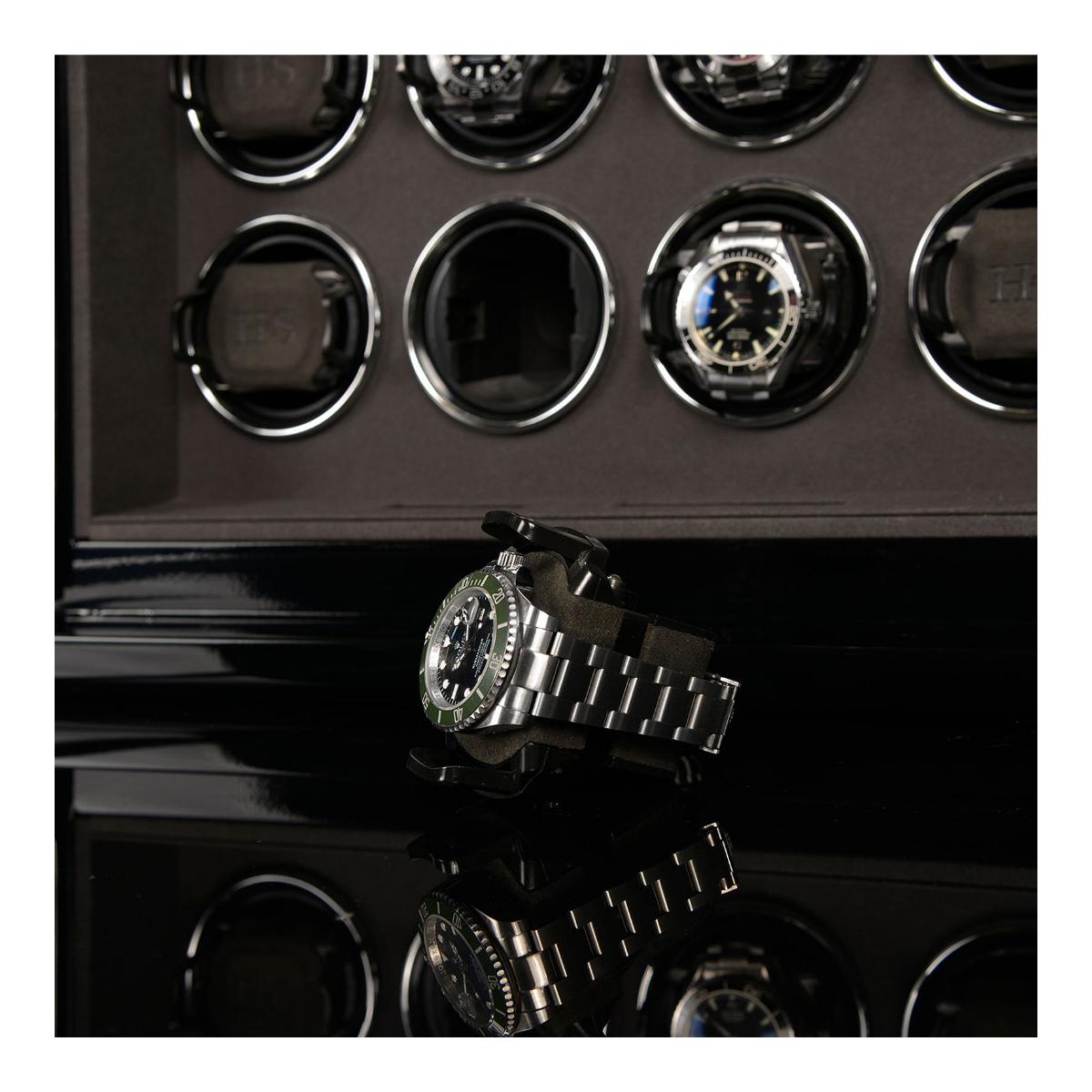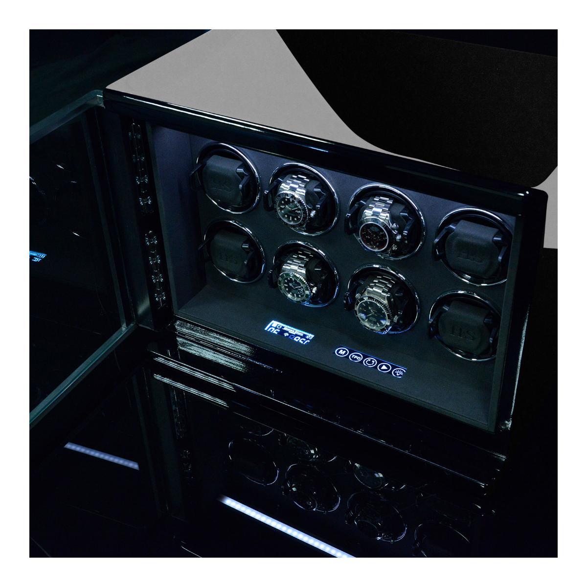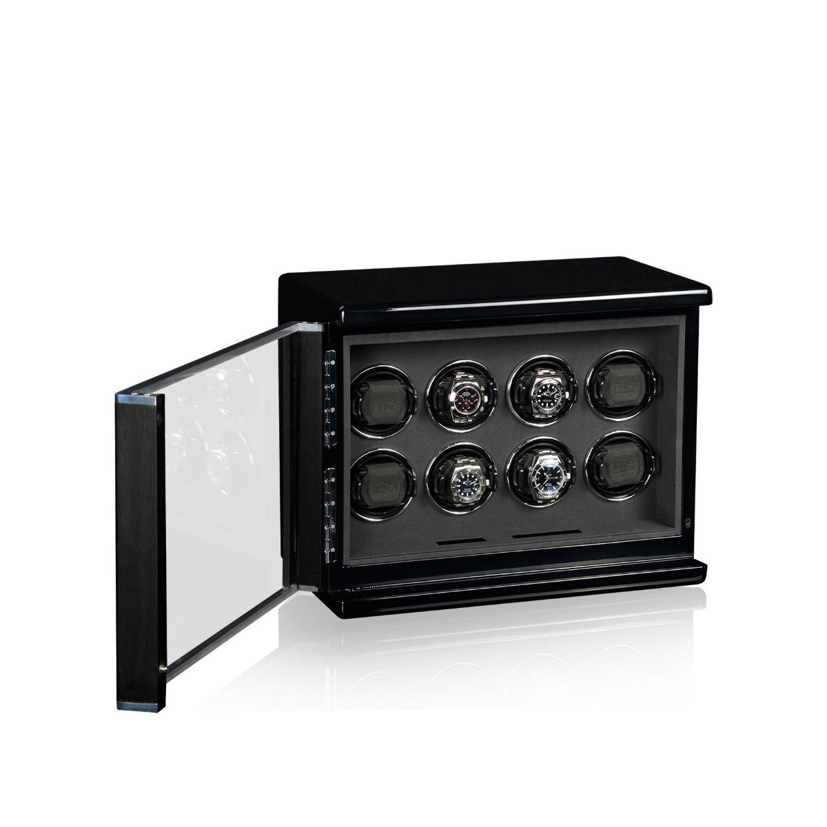 70 760 KčDřevěný natahovač Meranto 8 je v černém piano lesku na 8 hodinek, LCD podsvícený display pro pohodlné ovládání, materiál interiéru je velur, každý rotor lze samostatně naprogramovat, otáčení lze nastavit po směru ručiček, proti směru a také oboustranně, volba počtu denních otáček od 450 až 1500, vnitřní LED osvětlení které lze přepínat i zcela vypnout, mód "sleep phase", adaptér je součástí balení, váha 11kg, rozměr 41x33,5x25cm