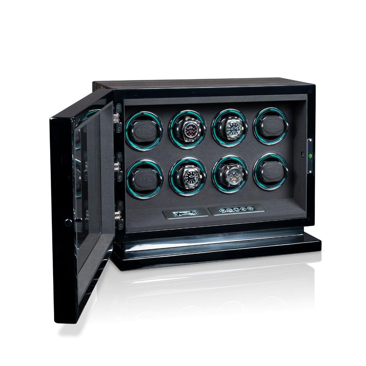 Dřevěný natahovač Rome 8 pro 8ks mechanických hodinek s automatickým nátahem. Tento krásný model z nové kolekce splňuje nejvyšší stardardy ohledně nové technologie a designu. HS Premium Drive - Unikátní technologie pohonu vyvinutá v Německu, která obsahuje pět kuličkových ložisek, snižuje zatížení motoru a převodovky na minimum. Výsledek: maximální hladkost, spolehlivost a trvanlivost. H&S Premium-Drive bez potíží otáčí i těžké hodinky ze zlata nebo platiny a zajišťuje jemné navíjení. Příjemné ovládání přes LCD display, kde lze každý rotor nastavit pro konkrétní model hodinek. Počet denních otáček (450, 550, 650, 750, 850, 950, 1200 a 1500), nastavení směru otáčení (doprava, doleva a oboustranné), výběr barvy podsvícení rotorů Motion-Light a ovládání vnitřního osvětlení natahovače Interior-Light. LCD display šetří energii tím, že pokud nedojde k dotyku během krátké doby, tak tento display zhasne. Aktivaci LCD displaye lze provézt opětovným lehkým stisknutím. S Fin-Protect jsou hodinky uvnitř natahovače zajištěny moderním zámkem na otisk prstu. Přímo na natahovači lze naprogramovat až 5 otisků prstů a v případě potřeby je opět vymazat. Užijte si pohodlí bezklíčového zámku. Oblíbená funkce "Sleep" - fáze spánku zajišťuje, že se hodinky neotáčejí mezi 22.00 a 11.00 a napodobuje běžný rytmus nošení automatických hodinek. Rotory během spánkové fáze zcela utichnou, takže natahovač hodinek lze ovládat i například v ložnici, aniž byste se museli obávat rušení spánku. Inteligentní řídicí elektronika zajišťuje, že naprogramované otáčky denního intervalu jsou vždy udržovány, i když je aktivní fáze spánku.