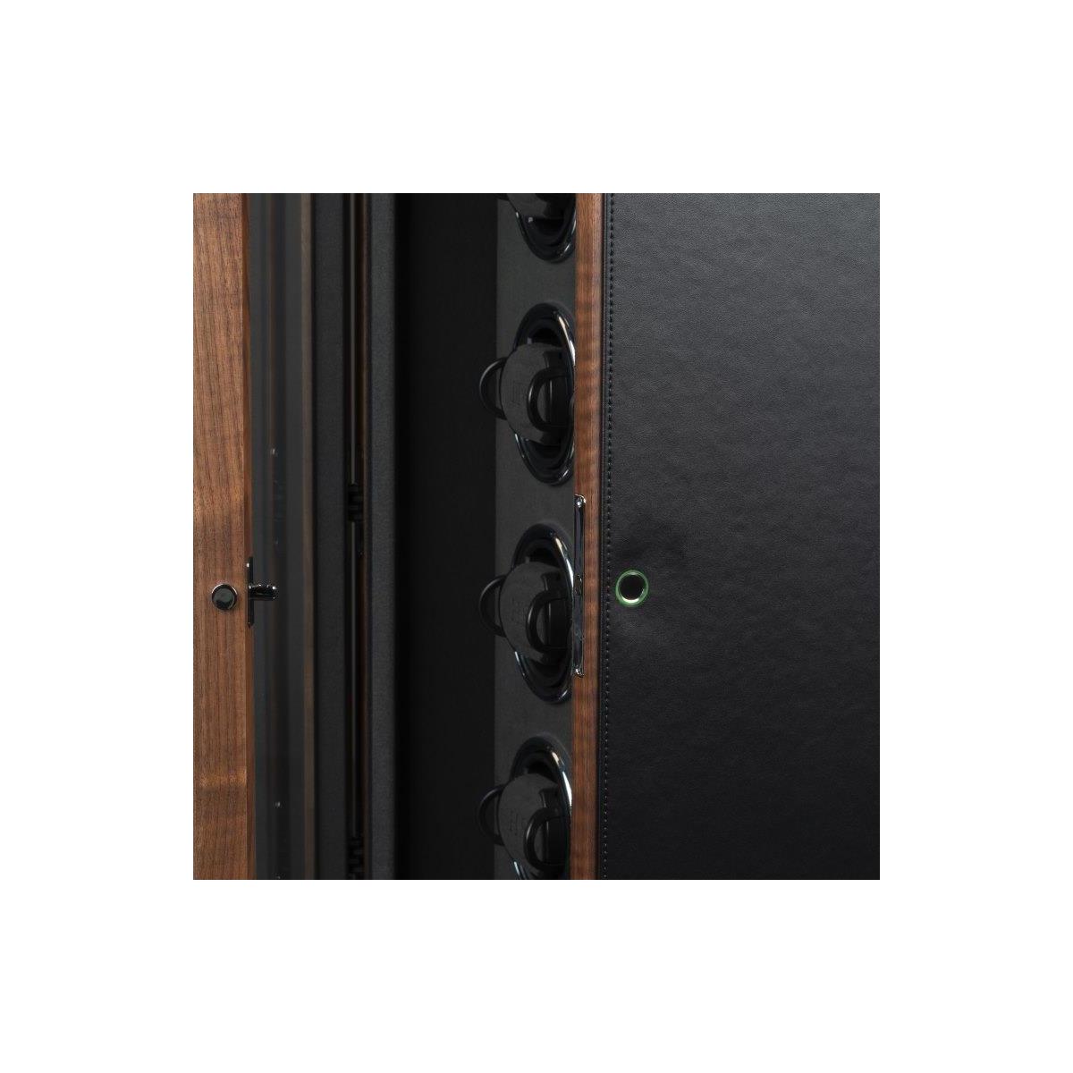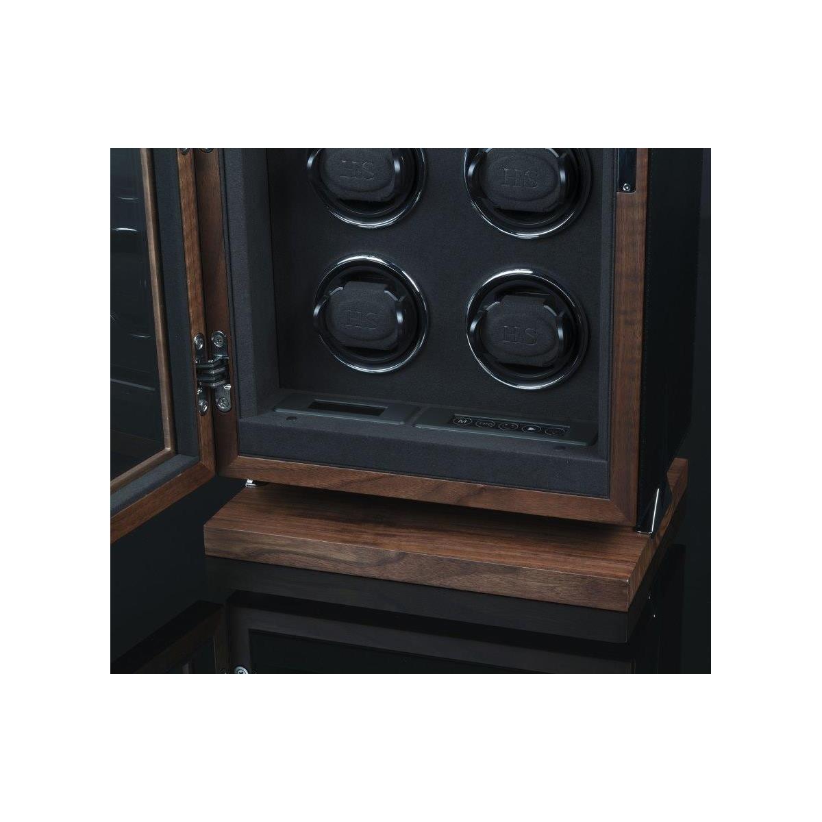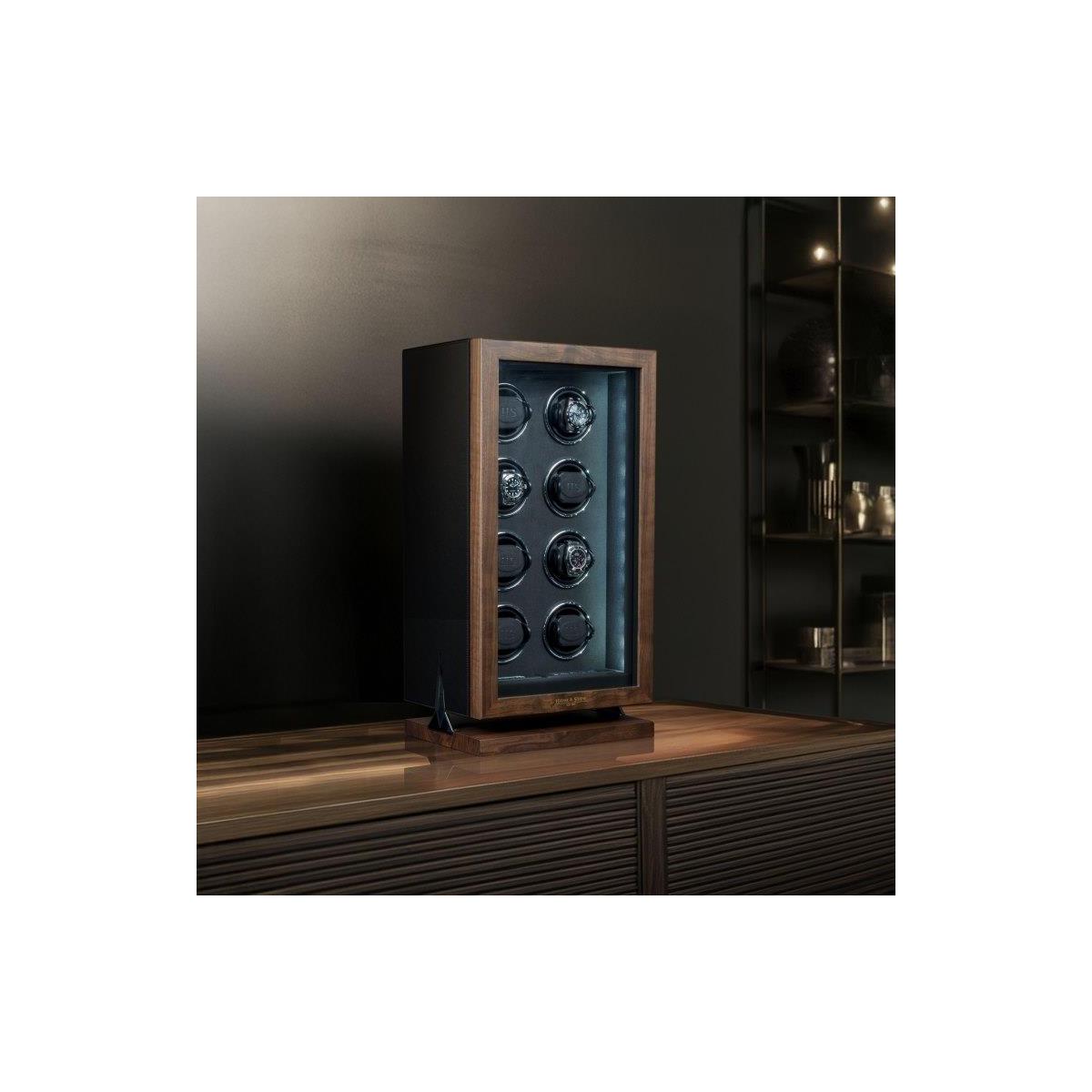 72 150 KčDřevěný natahovač Triton 8 pro 8ks mechanických hodinek s automatickým nátahem. Tento krásný, dřevěný model potažený černou kůží, splňuje nejvyšší stardardy ohledně nové technologie a designu. HS Premium Drive - Unikátní technologie pohonu vyvinutá v Německu, která obsahuje pět kuličkových ložisek, snižuje zatížení motoru a převodovky na minimum. Výsledek: maximální hladkost, spolehlivost a trvanlivost. H&S Premium-Drive bez potíží otáčí i těžké hodinky ze zlata nebo platiny a zajišťuje jemné navíjení. Příjemné ovládání přes LCD display, kde lze každý rotor nastavit pro konkrétní model hodinek. Počet denních otáček (450, 550, 650, 750, 850, 950, 1200 a 1500), nastavení směru otáčení (doprava, doleva a oboustranné), ovládání vnitřního osvětlení natahovače Interior-Light. LCD display šetří energii tím, že pokud nedojde k dotyku během krátké doby, tak tento display zhasne. Aktivaci LCD displaye lze provézt opětovným lehkým stisknutím. S Fin-Protect jsou hodinky uvnitř natahovače zajištěny moderním zámkem na otisk prstu. Přímo na natahovači lze naprogramovat až 5 otisků prstů a v případě potřeby je opět vymazat. Užijte si pohodlí bezklíčového zámku. Oblíbená funkce "Sleep" - fáze spánku zajišťuje, že se hodinky neotáčejí mezi 22.00 a 11.00 a napodobuje běžný rytmus nošení automatických hodinek. Rotory během spánkové fáze zcela utichnou, takže natahovač hodinek lze ovládat i například v ložnici, aniž byste se museli obávat rušení spánku. Inteligentní řídicí elektronika zajišťuje, že naprogramované otáčky denního intervalu jsou vždy udržovány, i když je aktivní fáze spánku. Natahovače hodinek z řady Triton vynikají výrazným designem. Estetický výběr barev a materiálů této řady skvěle ladí s různými styly vybavení a nabízí tak všestranné možnosti kombinací. Zvláštností této řady je chromovaný prvek ve tvaru hvězdy, který je umně integrován do základny natahovače hodinek. Pokročilý zámek se snímáním prstů (Fin-Protect) zajišťuje optimální zabezpečení a spolehlivě chrání vaše cenné hodinky před neoprávněným přístupem. Rozměr natahovače je 26,5x61x21cm, váha 14kg.