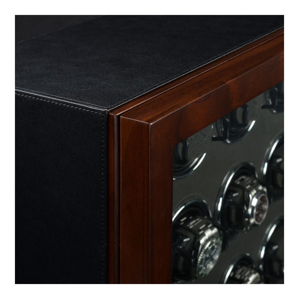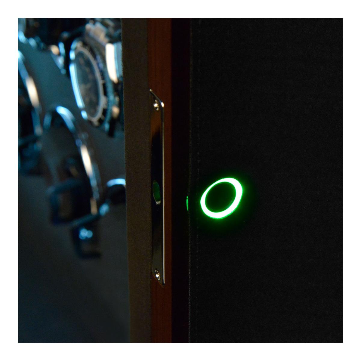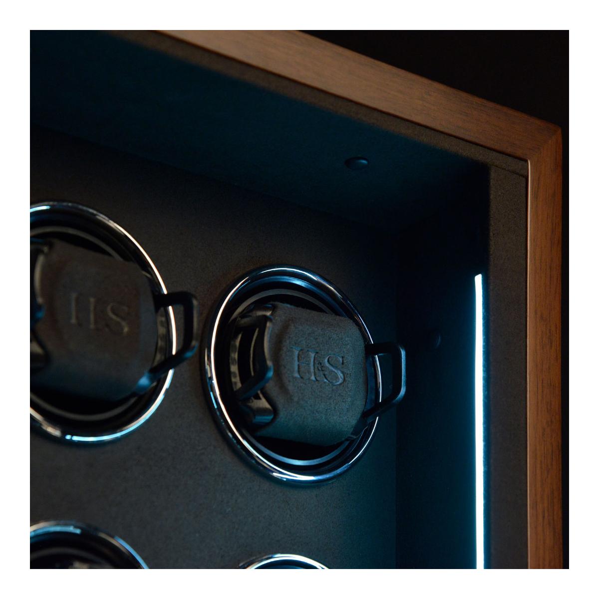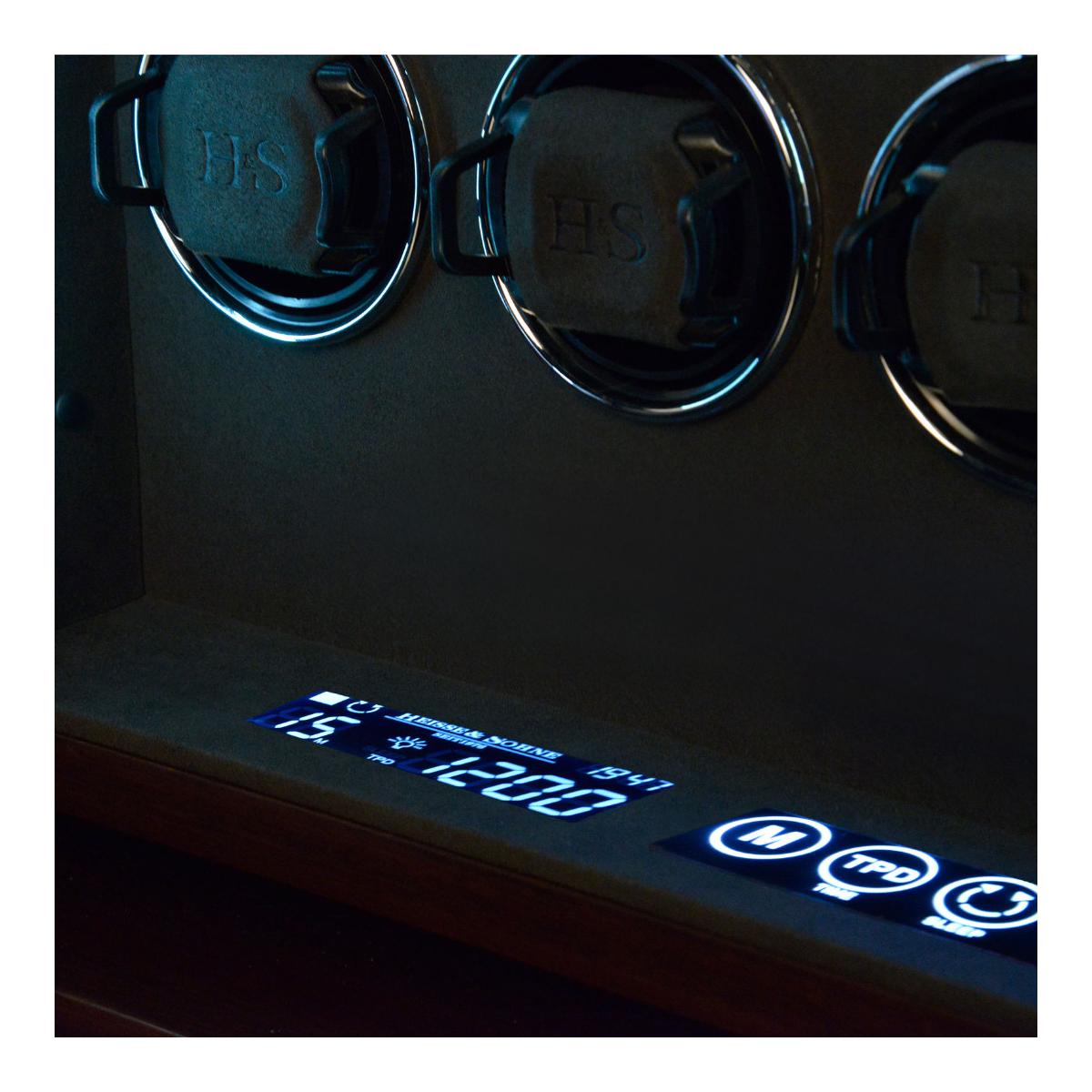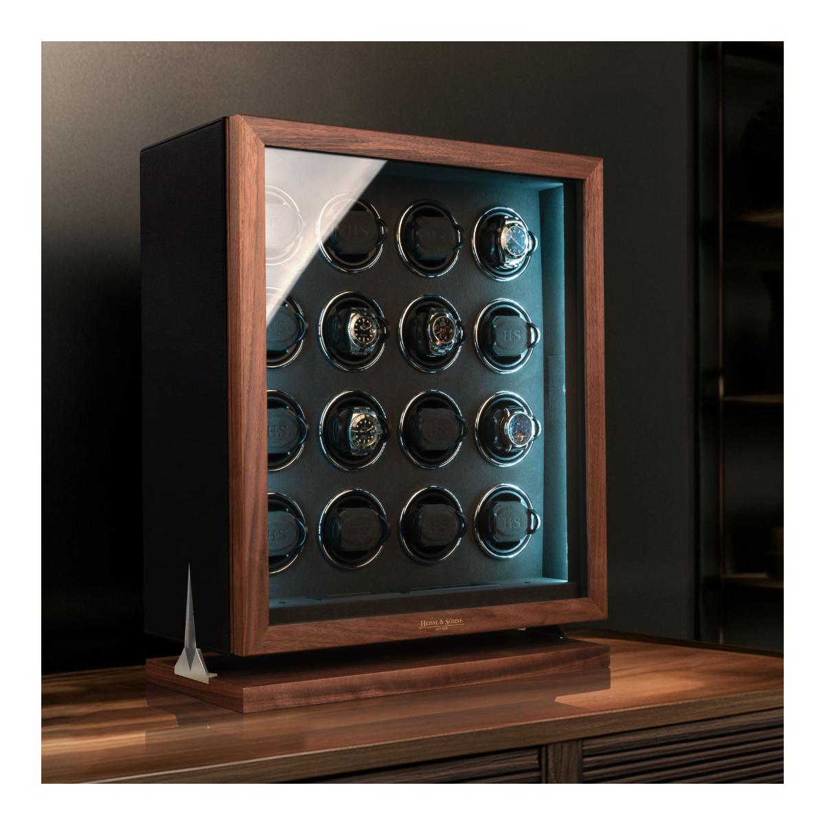 Dřevěný natahovač Triton 16 pro 16ks mechanických hodinek s automatickým nátahem. Tento krásný, dřevěný model potažený černou imitací kůže, splňuje nejvyšší stardardy ohledně nové technologie a designu. HS Premium Drive - Unikátní technologie pohonu vyvinutá v Německu, která obsahuje pět kuličkových ložisek, snižuje zatížení motoru a převodovky na minimum. Výsledek: maximální hladkost, spolehlivost a trvanlivost. H&S Premium-Drive bez potíží otáčí i těžké hodinky ze zlata nebo platiny a zajišťuje jemné navíjení. Příjemné ovládání přes LCD display, kde lze každý rotor nastavit pro konkrétní model hodinek. Počet denních otáček (450, 550, 650, 750, 850, 950, 1200 a 1500), nastavení směru otáčení (doprava, doleva a oboustranné), ovládání vnitřního osvětlení natahovače Interior-Light. LCD display šetří energii tím, že pokud nedojde k dotyku během krátké doby, tak tento display zhasne. Aktivaci LCD displaye lze provézt opětovným lehkým stisknutím. S Fin-Protect jsou hodinky uvnitř natahovače zajištěny moderním zámkem na otisk prstu. Přímo na natahovači lze naprogramovat až 5 otisků prstů a v případě potřeby je opět vymazat. Užijte si pohodlí bezklíčového zámku. Oblíbená funkce "Sleep" - fáze spánku zajišťuje, že se hodinky neotáčejí mezi 22.00 a 11.00 a napodobuje běžný rytmus nošení automatických hodinek. Rotory během spánkové fáze zcela utichnou, takže natahovač hodinek lze ovládat i například v ložnici, aniž byste se museli obávat rušení spánku. Inteligentní řídicí elektronika zajišťuje, že naprogramované otáčky denního intervalu jsou vždy udržovány, i když je aktivní fáze spánku. Natahovače hodinek z řady Triton vynikají výrazným designem. Estetický výběr barev a materiálů této řady skvěle ladí s různými styly vybavení a nabízí tak všestranné možnosti kombinací. Zvláštností této řady je chromovaný prvek ve tvaru hvězdy, který je umně integrován do základny natahovače hodinek. Pokročilý zámek se snímáním prstů (Fin-Protect) zajišťuje optimální zabezpečení a spolehlivě chrání vaše cenné hodinky před neoprávněným přístupem. Rozměr natahovače je 26,5x61x21cm, váha 14kg.