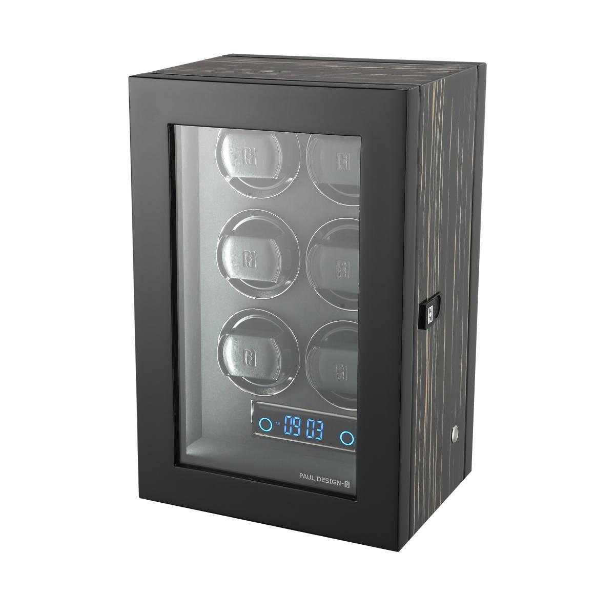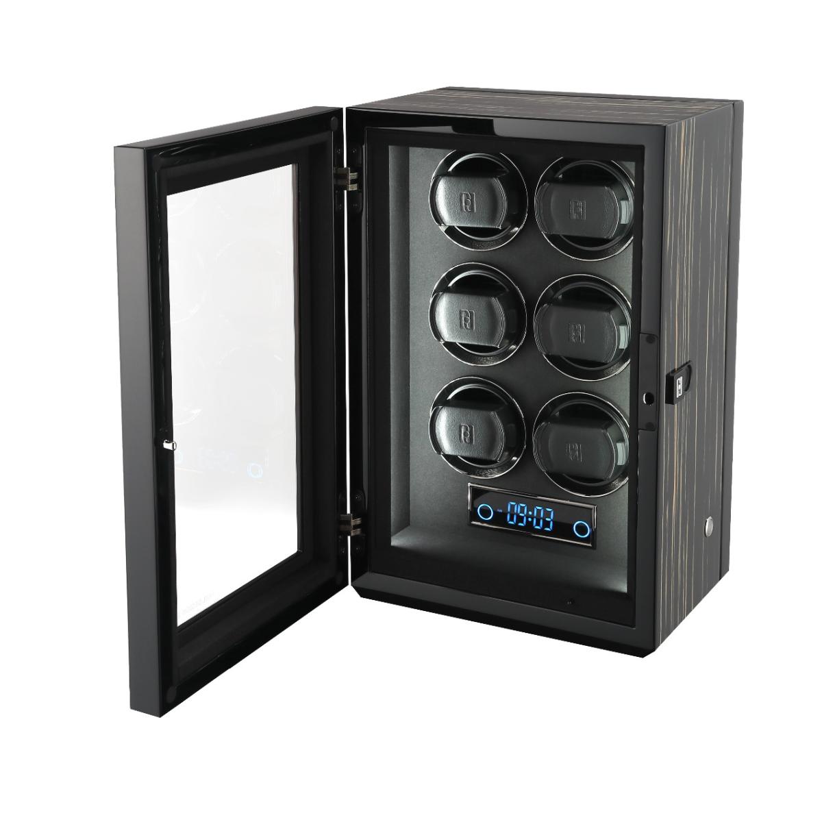41 200 KčDřevěný natahovač pro 6 hodinek, prosklené přední víko, ovládání a programování dálkovým ovladačem a také na dotykovém displayi, každý rotor lze samostatně programovat, denní otáčky v rozmezí 480 až 1920, vnitřní LED podsvícení, zámek na otisk prstu, možnost volby směru otáčení doprava, doleva a oboustranně, adaptér je součástí balení, rozměr je 27,2x21,5x43cm, váha 8,8kg